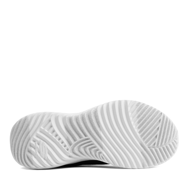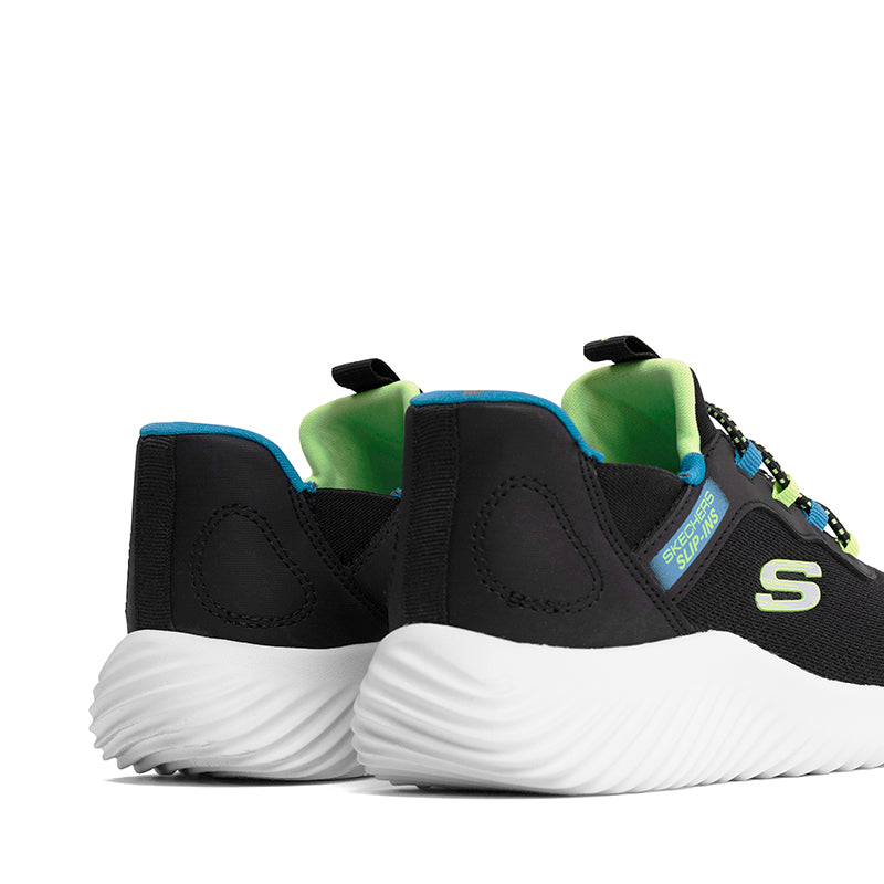 The Skechers SLIP INS BOUNDER PS delivers fuss-free wear with a mesh/synthetic upper, stretch laces, and adaptive closure, while a foam insole cushions every step and a flexible rubber outsole offers solid grip. The heel pull-in design lets kids slip them on easily, and the machine-washable materials simplify care.
