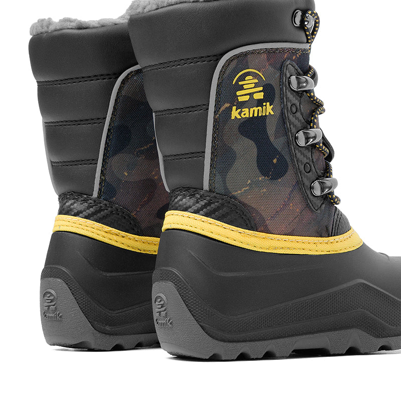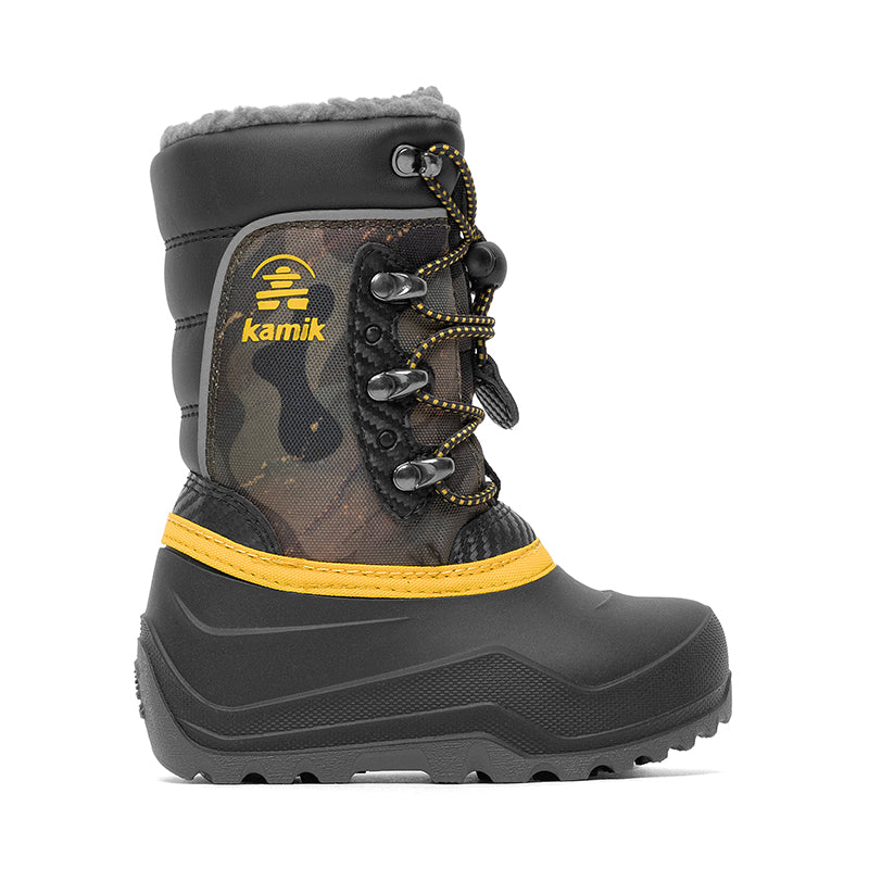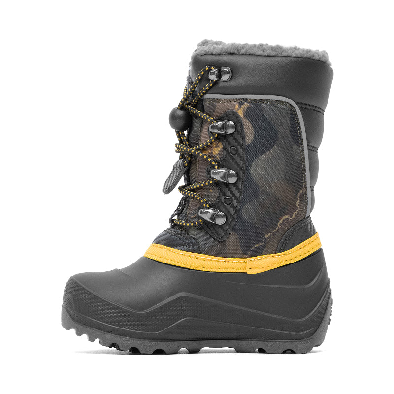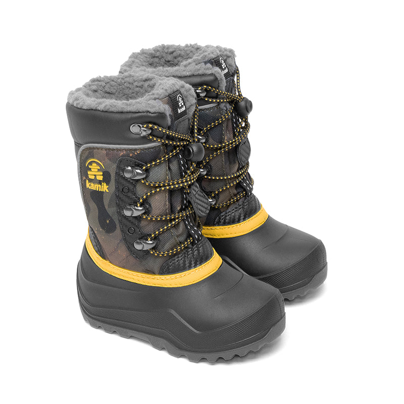 The Kamik LUKE 4 is a rugged kids’ winter boot built to protect little feet in extreme cold: it features a waterproof 1200-denier nylon and synthetic leather upper, fixed foam and fleece insulation rated to about –40 °C, a moisture-wicking soft-boa lining, an adjustable snow collar to seal out snow, a bungee lace system with an Easy-Grab lace-lock for quick tightening, and a lightweight, waterproof RubberHe® shell with ICEWAVE™ multi-directional lugs for secure traction in snowy conditions.