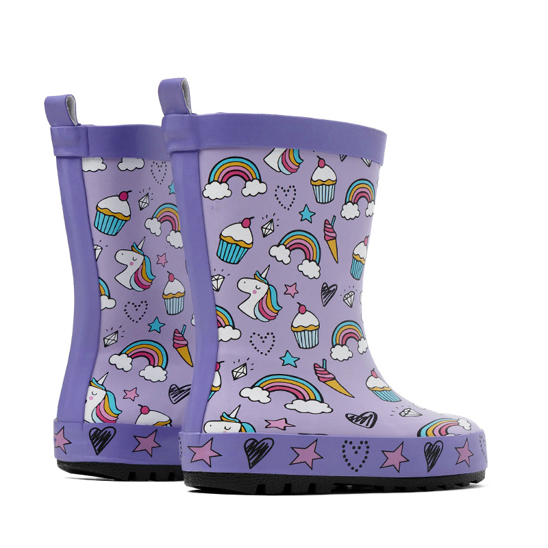 This kids’ rain boot features a waterproof rubber upper decorated with colorful unicorn, rainbow, and cupcake graphics for a cheerful and playful look. Designed to keep little feet dry in wet conditions, it offers a comfortable interior and an easy pull-on construction with a rear pull tab. The sturdy outsole provides reliable traction on slippery surfaces, making it ideal for rainy days, puddle jumping, and outdoor adventures. Lightweight and durable, this boot combines protection with imaginative style for everyday fun.