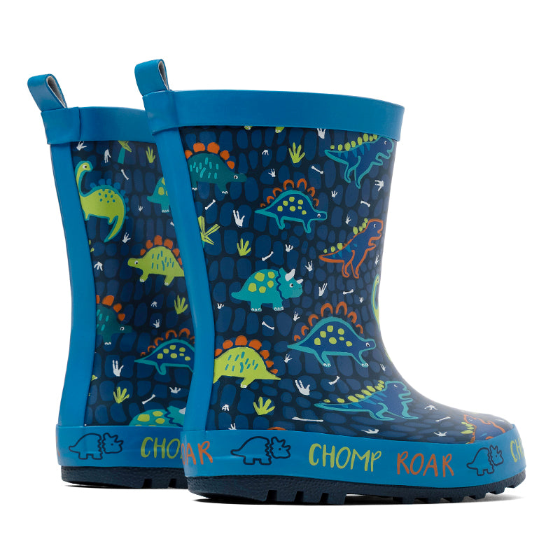 This kids’ rain boot features a waterproof rubber upper decorated with playful dinosaur graphics for a fun and adventurous look. Designed to keep little feet dry in wet conditions, it offers a comfortable interior lining and an easy pull-on construction. The sturdy outsole provides reliable traction on slippery surfaces, making it ideal for rainy days, puddle jumping, and outdoor play. Durable and lightweight, this boot combines protection and imaginative style for everyday adventures.