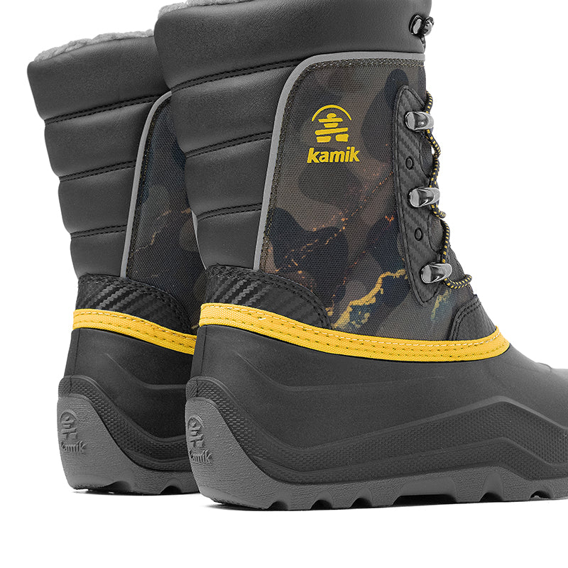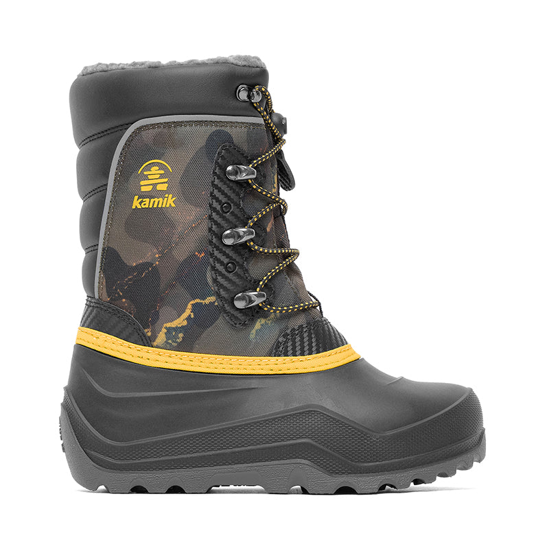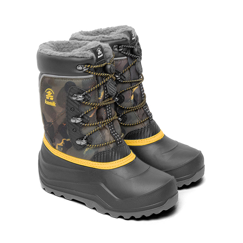 The Kamik LUKE 4 is a durable, cold-weather snow boot for kids engineered for extreme winter conditions: it features a waterproof 1200-denier nylon and synthetic leather upper, fixed foam and fleece insulation plus a soft boa lining rated for comfort down to –40 °C, and an adjustable snow-collar to seal out snow and moisture. A waterproof, lightweight RubberHe™ shell and ICE WAVE outsole with multi-directional lugs deliver strong traction on snow or ice, while a quick bungee-lace system with Easy-Grab Lace Lock ensures a secure fit in seconds — perfect for sledding, winter play, or everyday snow-time adventures.