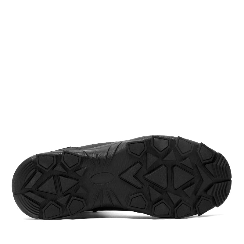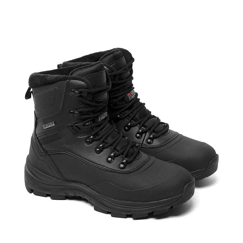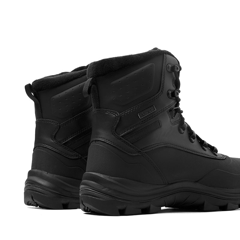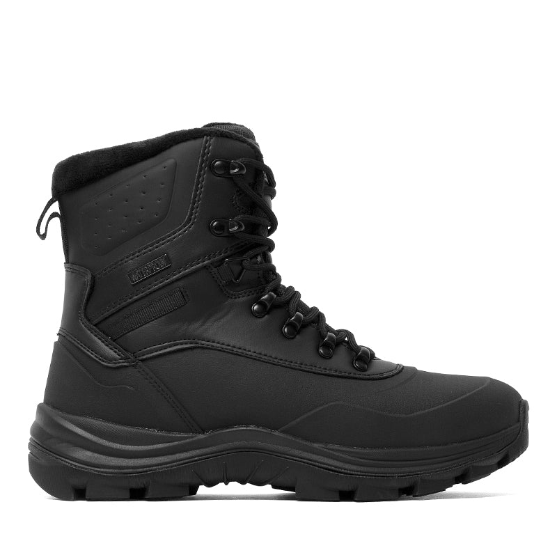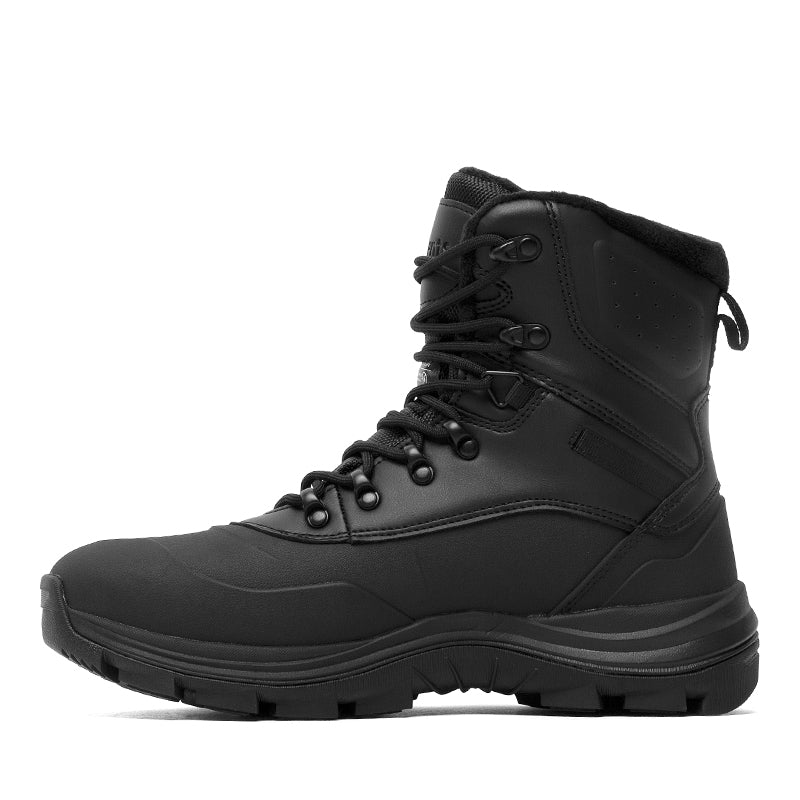 This rugged black winter boot is designed for durability, warmth, and protection in harsh conditions. Built with a waterproof upper and sealed seams, it keeps feet dry in snow and slush. The lace-up design ensures a secure fit, while the padded collar adds comfort and support around the ankle. An insulated lining helps lock in warmth, and the heavy-duty rubber outsole delivers excellent traction on icy and uneven terrain. Perfect for winter work, outdoor activities, or everyday wear in extreme weather.
