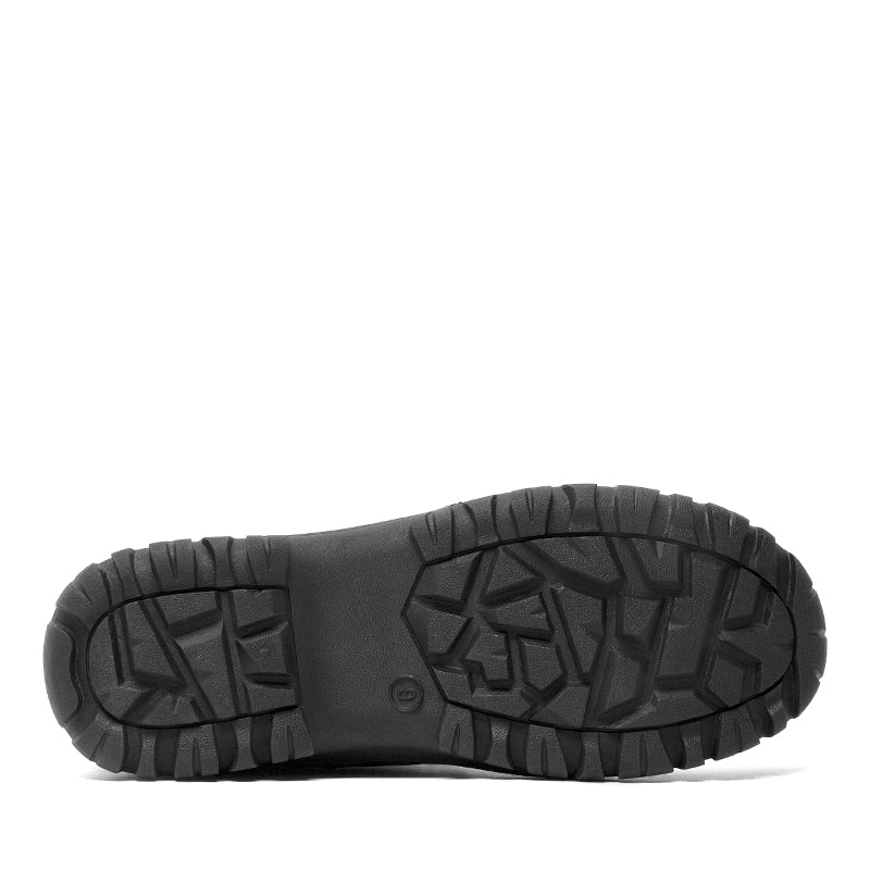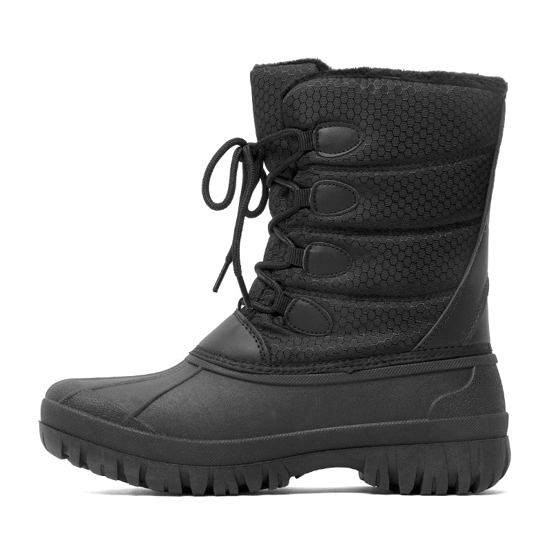 This rugged black winter boot is designed to withstand harsh conditions while keeping feet warm and dry. Built with a waterproof shell and a durable textile upper featuring a hexagonal quilted pattern, it combines resilience with style. The lace-up closure ensures a secure fit, while the insulated lining locks in heat for all-day comfort. A heavy-duty rubber outsole delivers reliable traction on snow and ice, making it an essential boot for winter commutes and outdoor activities.
