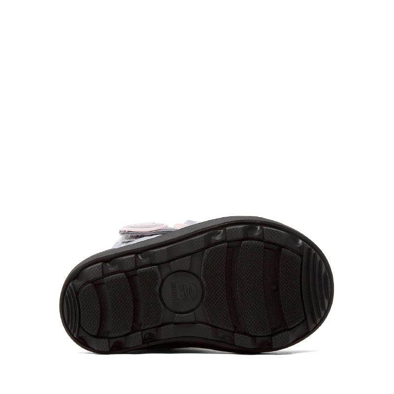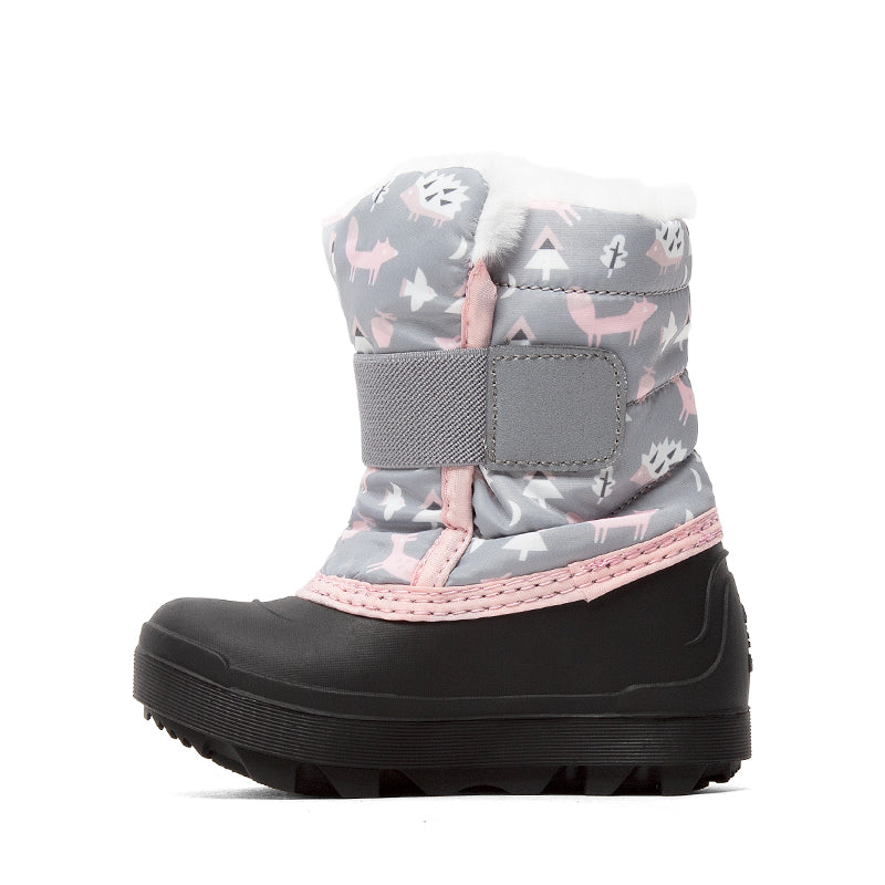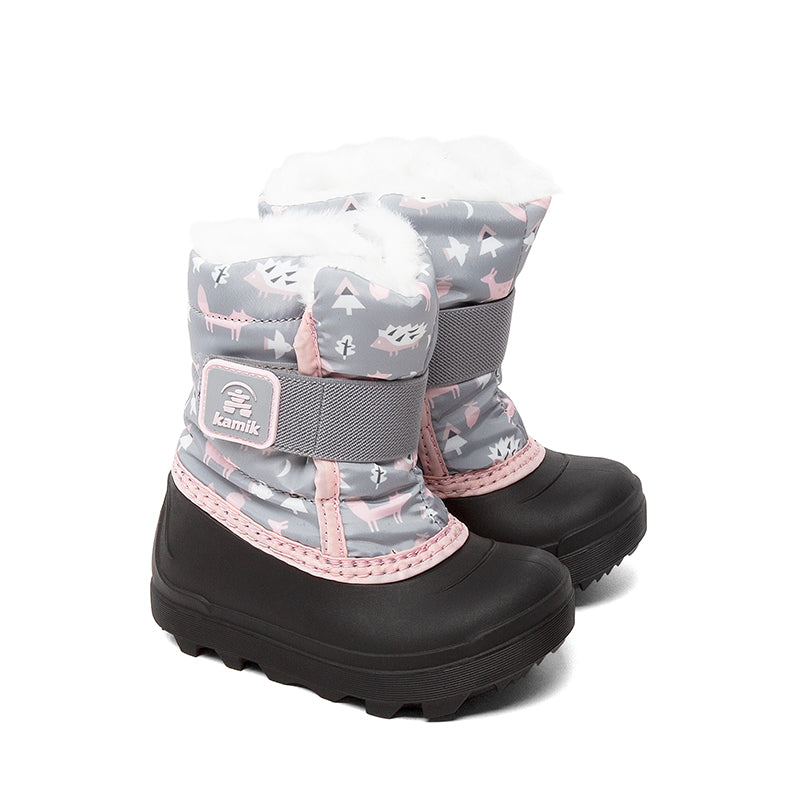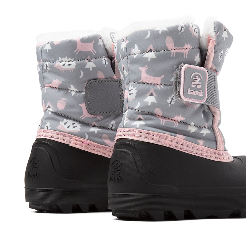 The Kamik SNOWBUG 7 P render in cheerful prints is a toddler winter boot engineered for warmth and dryness in cold conditions: its waterproof nylon upper with DriDefense™ membrane keeps moisture out, while fixed foam and faux fur insulation plus a moisture-wicking faux fur lining trap cozy warmth (comfort rated to –23 °C / –10 °F). It features an easy-on wide opening and an adjustable elastic hook-and-loop strap (gore panel design), plus a waterproof synthetic rubber shell with deep treads for traction in snow. In toddler size 7, it measures about 6 ³⁄₄ in / 17 cm shaft height, has an 8 ³⁄₅ in / 21.6 cm shaft circumference, and weighs approximately 1 lb 10.1 oz (≈ 740 g)