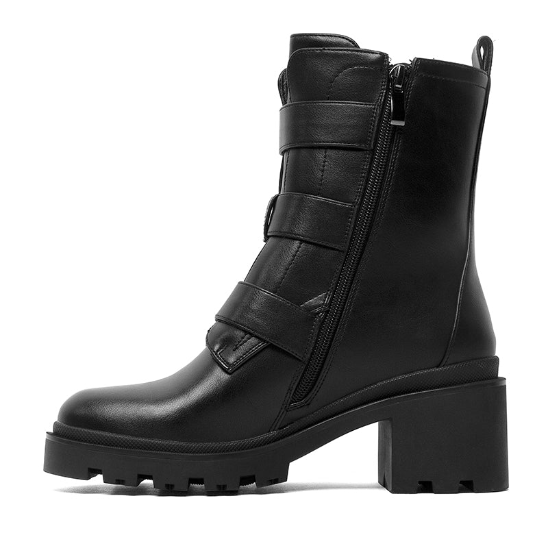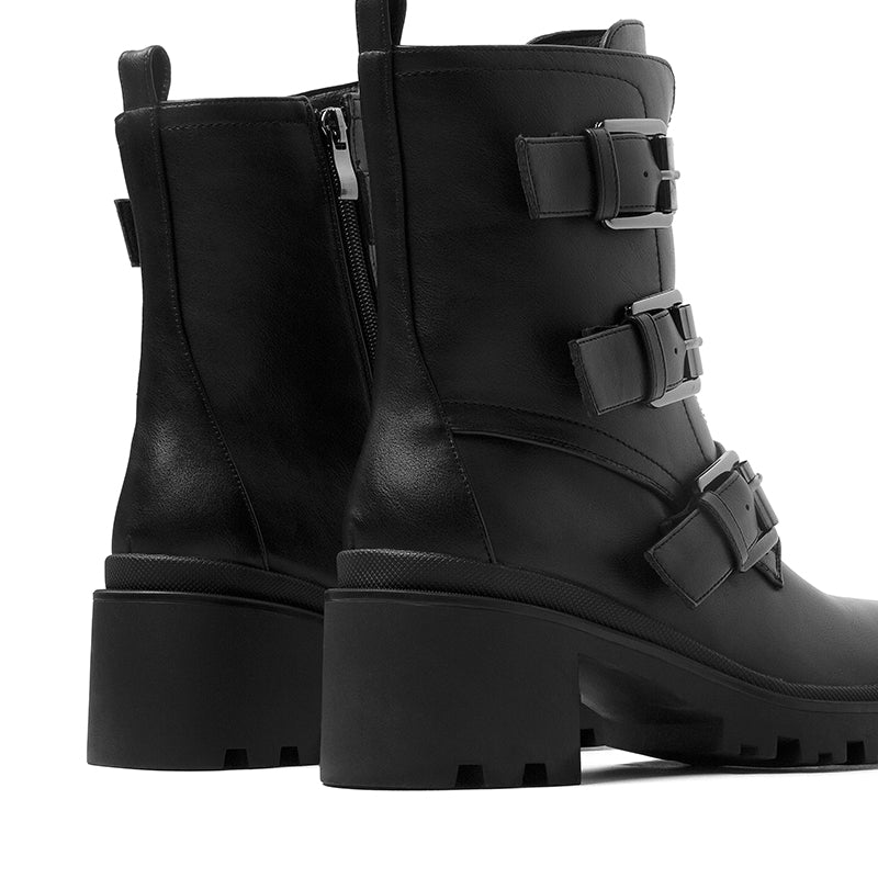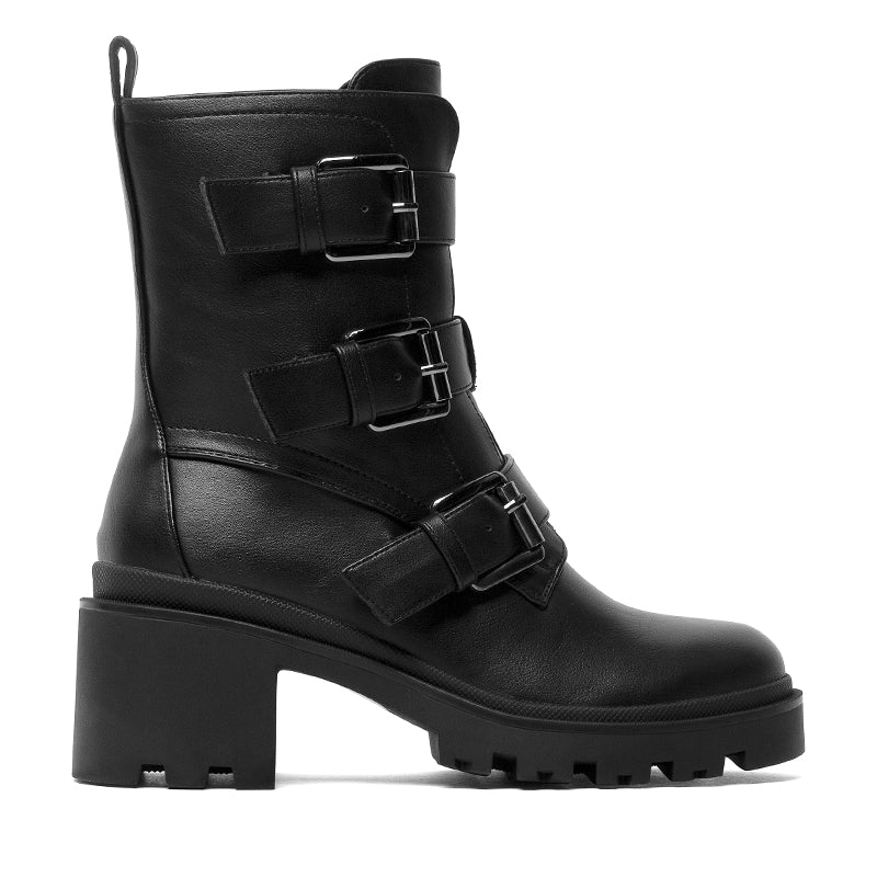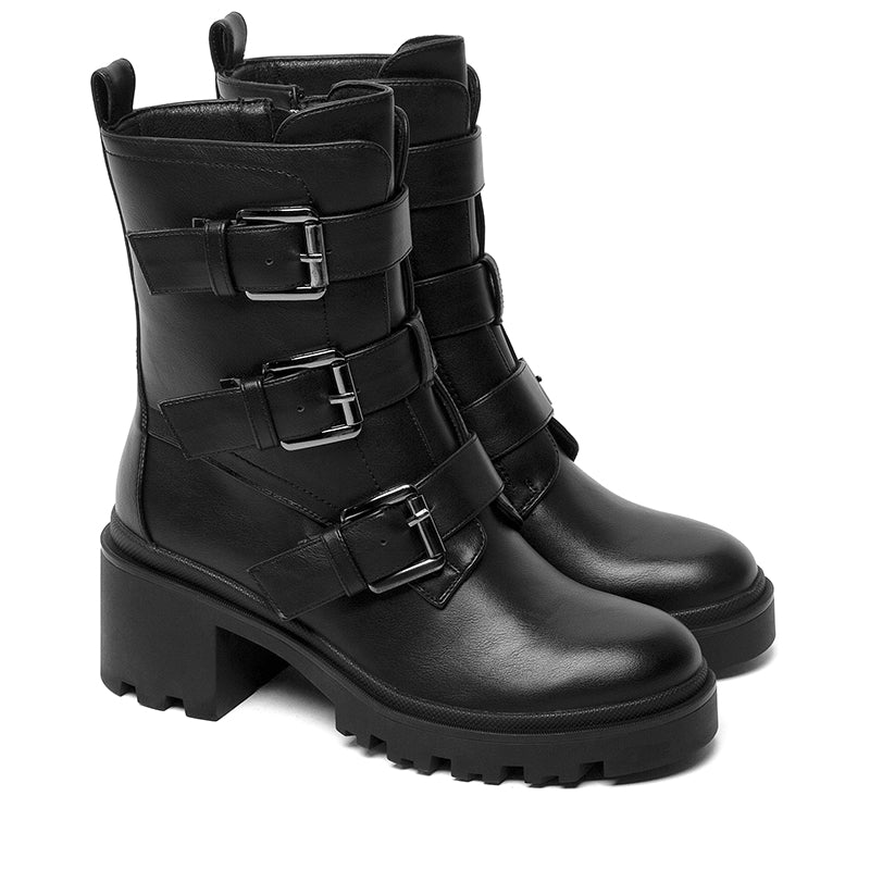 The Aqua Moda ZOE boot delivers a fearless look with a matte finish, striking metal buckles, a heavy lug sole, and a bold block heel, all balanced by a side zip that keeps the fit practical yet unapologetically tough.