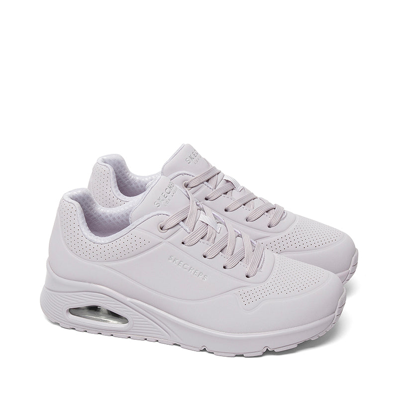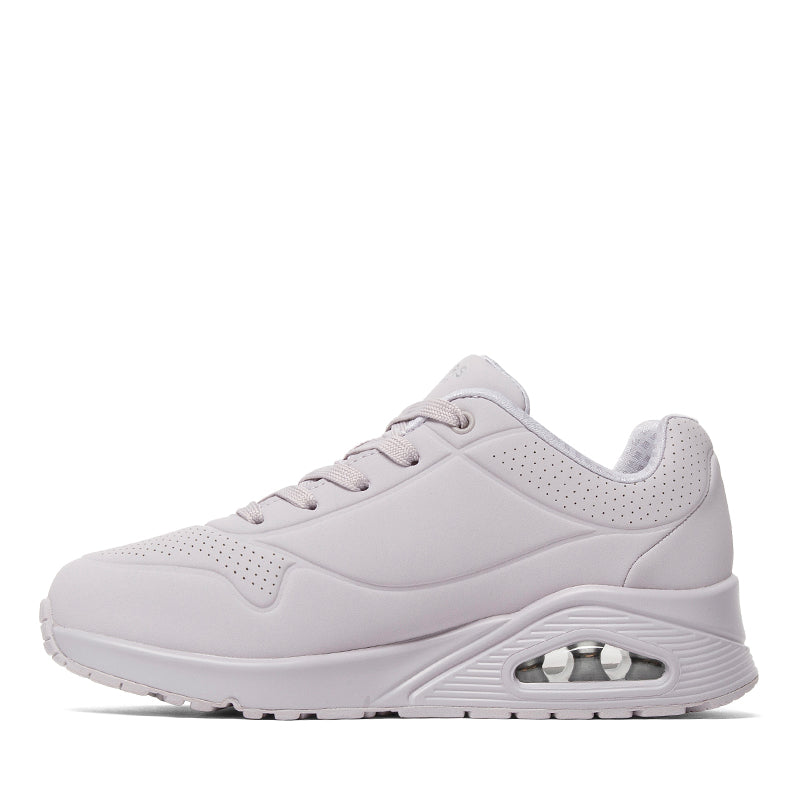 Experience airy comfort with the Skechers UNO STAND ON AIR. These lace-up fashion sneakers feature a smooth perforated synthetic upper for optimal breathability. The Skechers Air-Cooled Memory Foam® insole provides all-day comfort, while the visible Skech-Air® air-cushioned midsole adds extra cushioning, perfect for everyday wear. The 1.5-inch heel offers a stylish height boost while remaining comfortable. Ideal for any occasion, these sneakers combine style and technology for a modern, casual look.