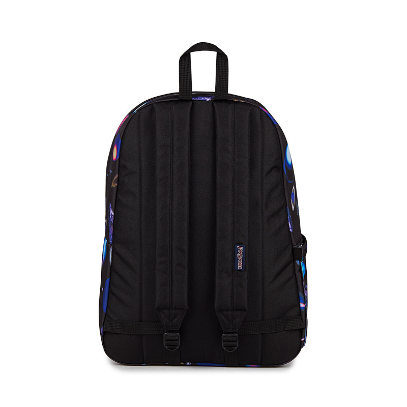 The Jansport SUPERBREAK PLUS PRINT brings fresh personality to a classic design with all-over prints on its durable 600-denier polyester body, featuring a roomy main compartment, internal padded 15-inch laptop sleeve, side water bottle pocket, front utility pocket with organizer, and fully padded back panel and straight-cut shoulder straps for comfort—boasting dimensions of approximately 16.5" × 12.5" × 5.5" (42 × 32 × 13 cm), capacity around 26 L, and lightweight at roughly 14 oz (0.4 kg) for daylong convenience and standout style.