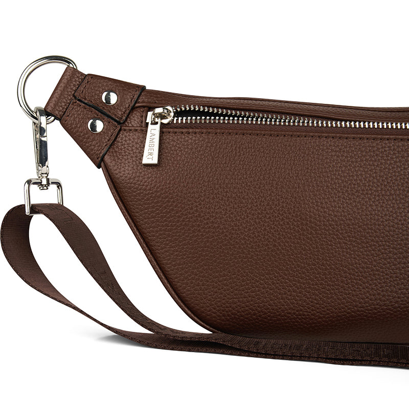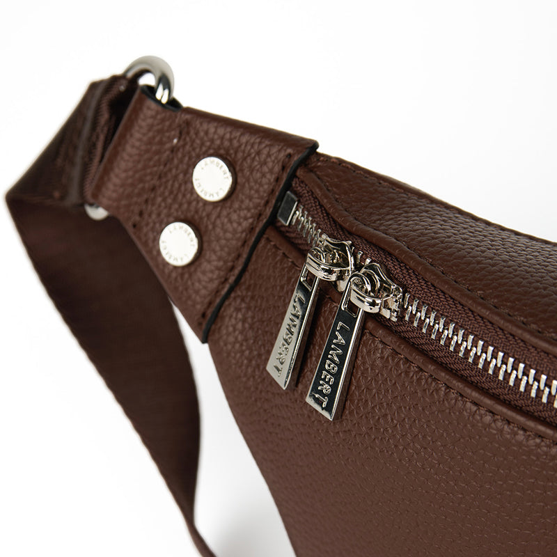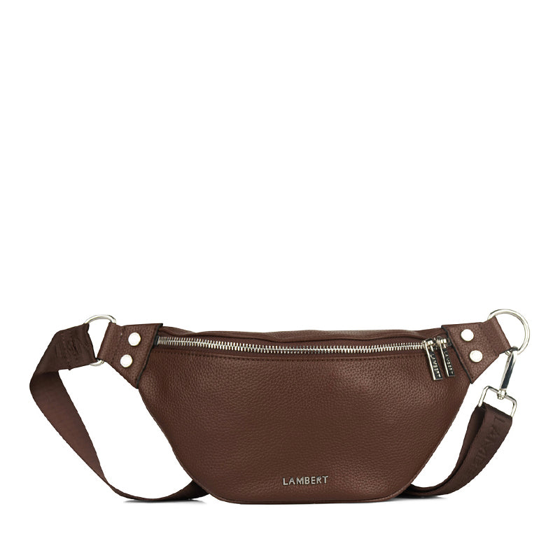 The Lambert SARAH belt bag by Lambert, in collaboration with Sarah Couture, fuses minimalist fashion with everyday utility: made from high-quality vegan leather, it features a sleek compact silhouette with a main compartment, a rear zipped pocket, an interior zipped pocket, four card slots, and a key-clip, all lined with recycled polyester; the adjustable woven strap with logo lets you wear it around the waist or crossbody, and its dimensions—approximately 27 cm (width) × 14.5 cm (height) × 5.5 cm (depth)—make it ideal for carrying essentials in style.