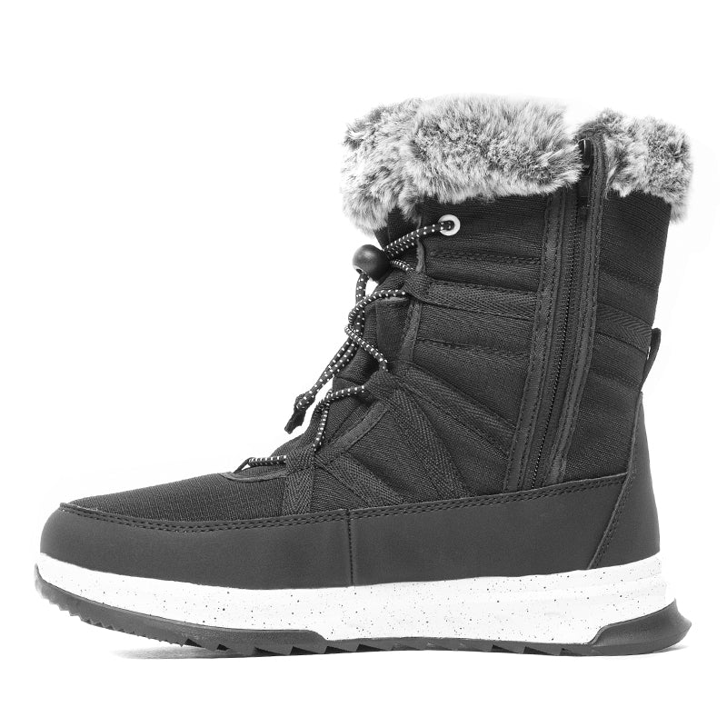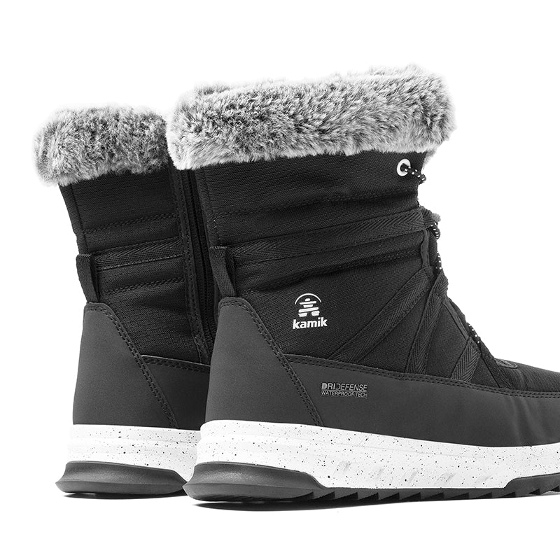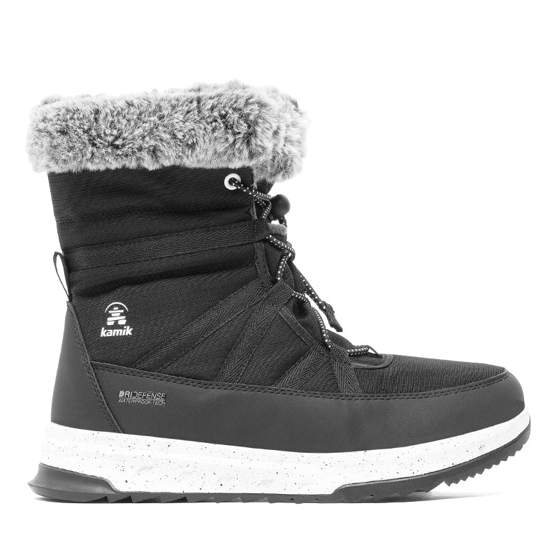 The Kamik STORMY F is a robust winter boot designed for kids, offering serious cold-weather protection with style: it features a waterproof nylon upper with the DriDefense™ membrane to keep feet dry, a cozy faux-fur snow collar and moisture-wicking fleece lining for warmth down to approximately –25 °F, a secure bungee lace system with easy-grab lace lock for quick adjustability, a removable EVA footbed for comfort, and a self-cleaning rubber outsole with GripXT™ to deliver reliable traction on snowy surfaces.